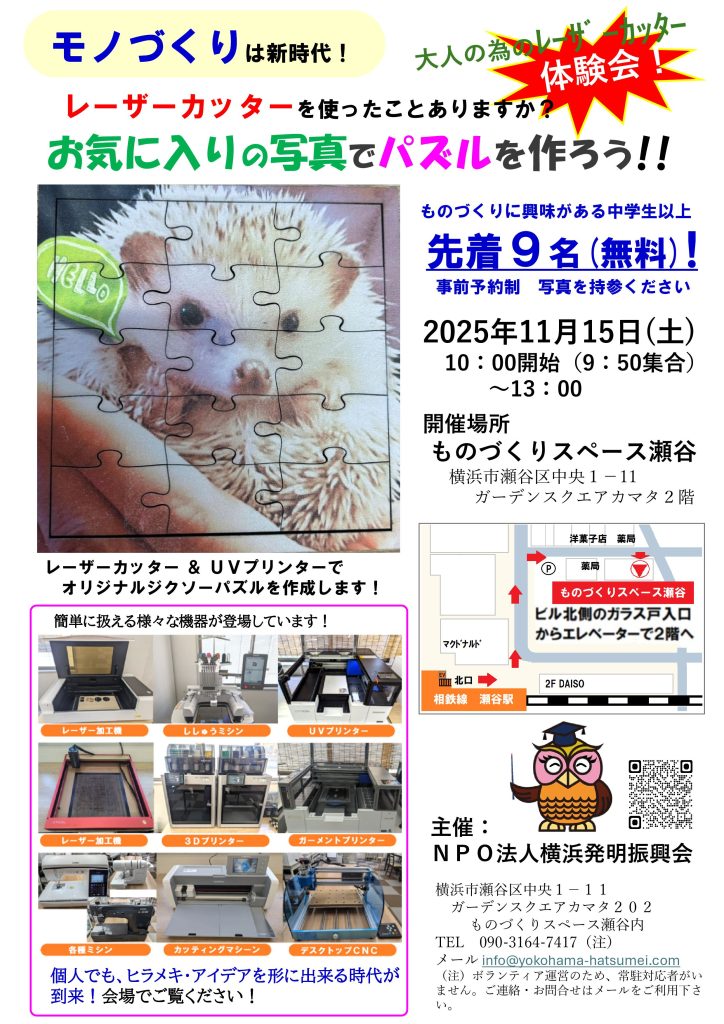 ○ 11月15日「レーザー加工機体験会」に参加希望の方は、11月13日(木)までに、info@yokohama-hatsumei.com宛、メール連絡(氏名、住所、緊急連絡先など)願います。先着9名になり次第、実際に作成する体験を締め切らせていただきます。