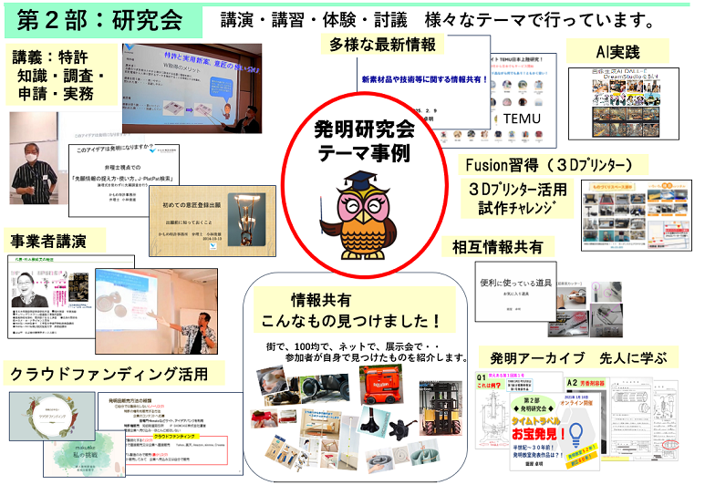 第2部:発明研究会では、特許関連知識強化の為の講義や、発明品を扱う事業者の講演から、最新技術や新商品・アイデア品の情報共有まで様々です。